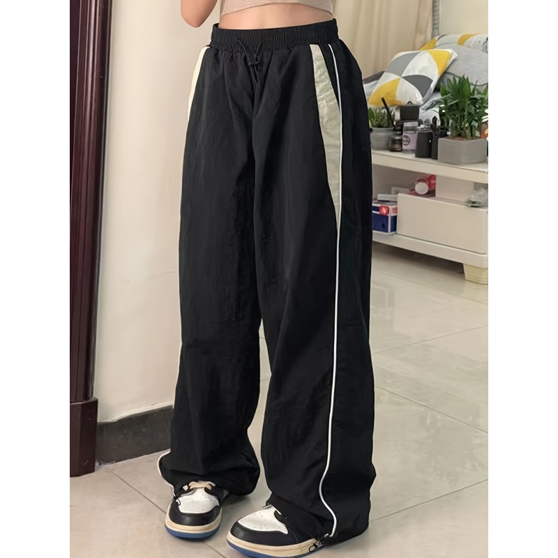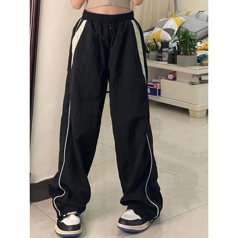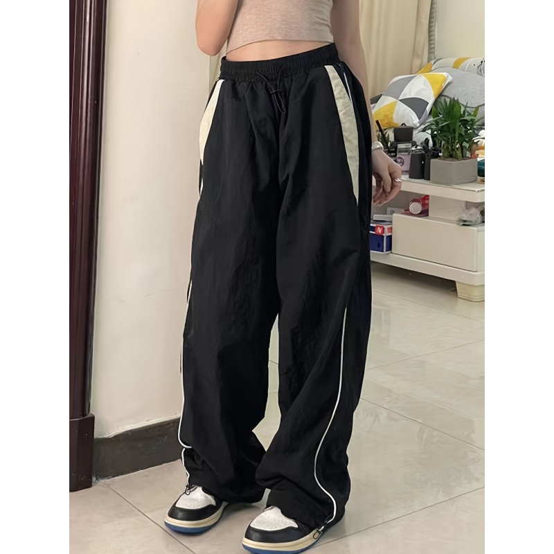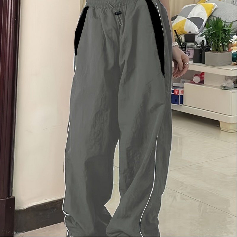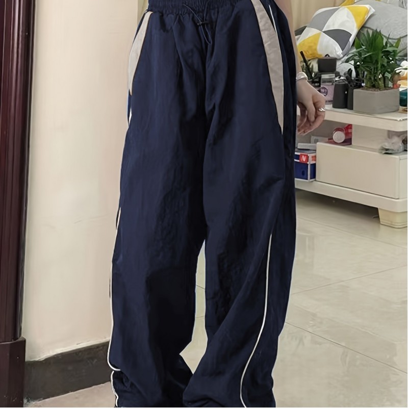 Color Block Cargo Pants, Y2K Drawstring Elastic Waist Wide Leg Pants, Women's Clothing