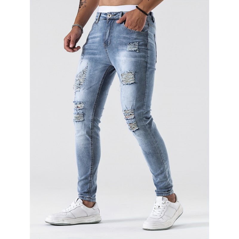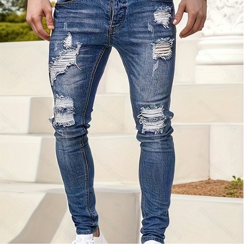 Slim Fit Ripped Jeans, Men's Casual Street Style Distressed Medium Stretch Denim Pants