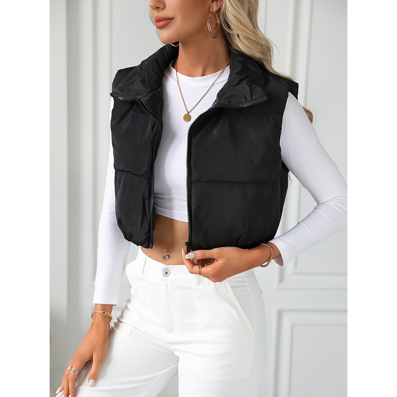 Zip Up Cropped Vest Coat, Casual Solid Sleeveless Stand Collar Outerwear, Women's Clothing