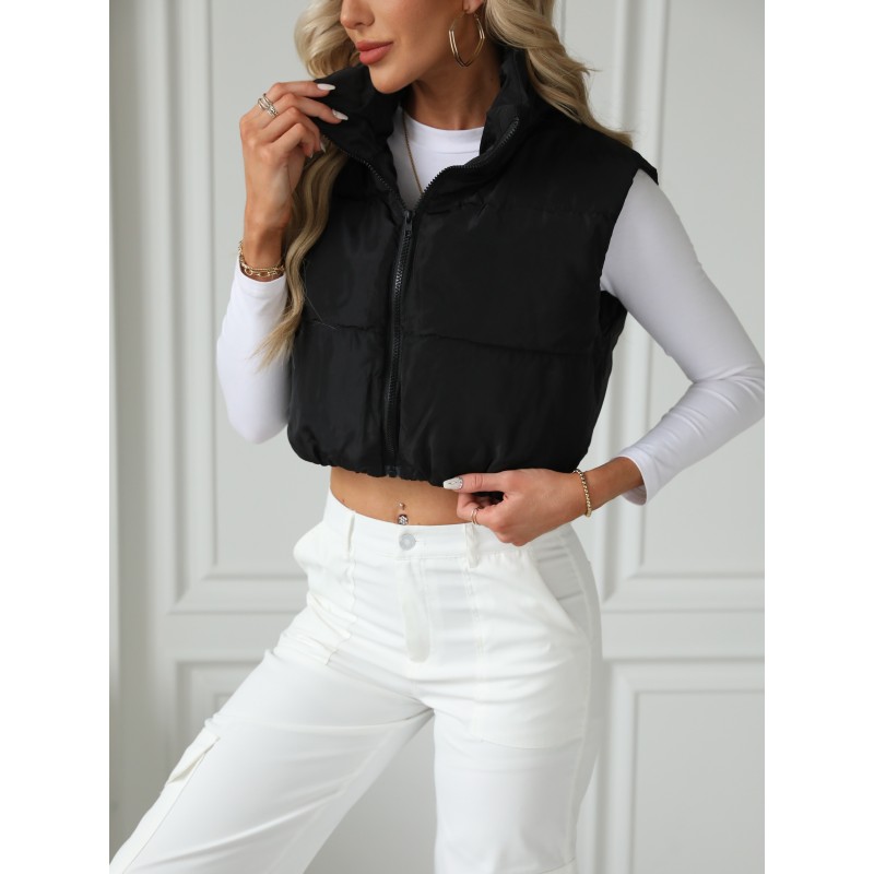 zip up cropped vest coat casual solid sleeveless stand collar outerwear womens clothing details 0